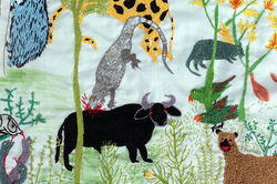 El proceso de producción comenzó con la transcripción de una serie de dibujos de animales extraídos de un cuaderno antiguo de contabilidad, en donde mi nono dibujaba creando un inventario personal. Primero los replicamos exactamente igual, en pose, calmados, pero luego de varios meses de trabajo, comienza a aparecer en la tela el enfrentamiento, la sangre, la violencia, los ataques. Así es como a simple vista la sutileza de la técnica y de los materiales se contraponen con los signos de una violenta supervivencia, metáfora de la vida.