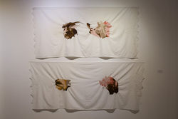 Son la piel del abuelo Tito, la piel de la abuela Edelvina, las toallas de Marta, Mónica y Marcelo. Es un terraplén. (Nos dice Daniela Arnaudo con los títulos que enuncian sus piezas bordadas).